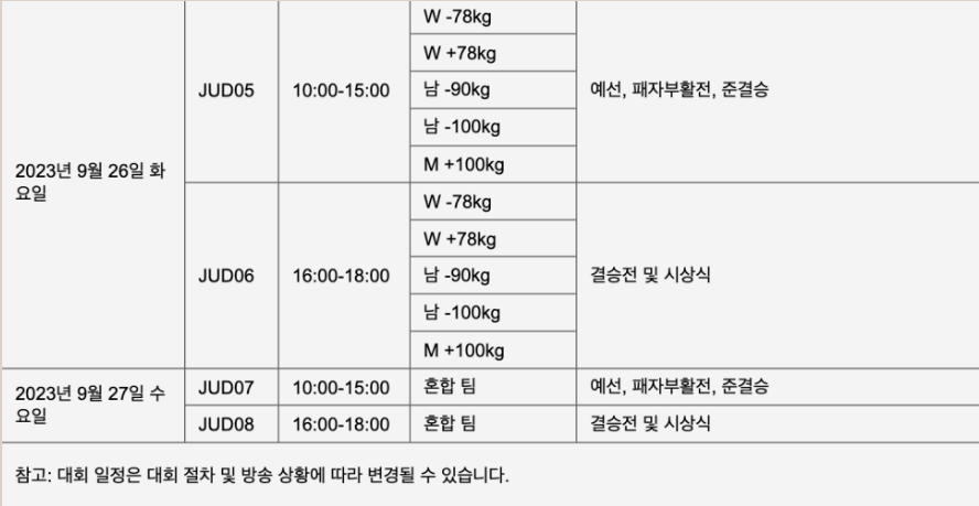| 남성 | 9월 26일 | 오후 4시 ~ 오후 6시 | 90kg, 100kg 결승전 및 시상식 | 여성 | 9월 26일 | 오후 4시 ~ 오후 6시 | -78kg, +78kg 결승 |
